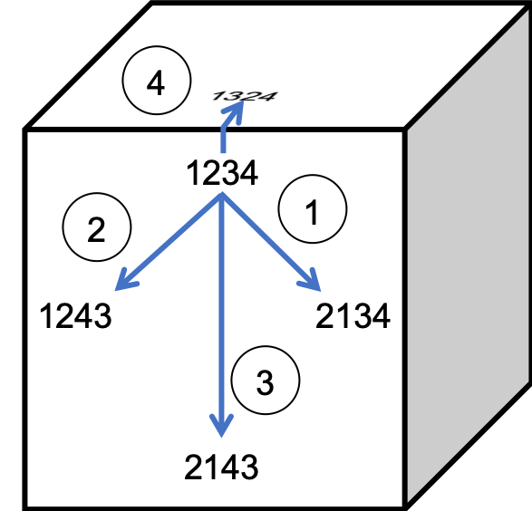 The 24 permutations of four can be laid out on a cube so that the rows closest together are those connected by these four changes. Here is the cube face that includes rounds (1234); the circled numbers correspond to the four changes listed above.